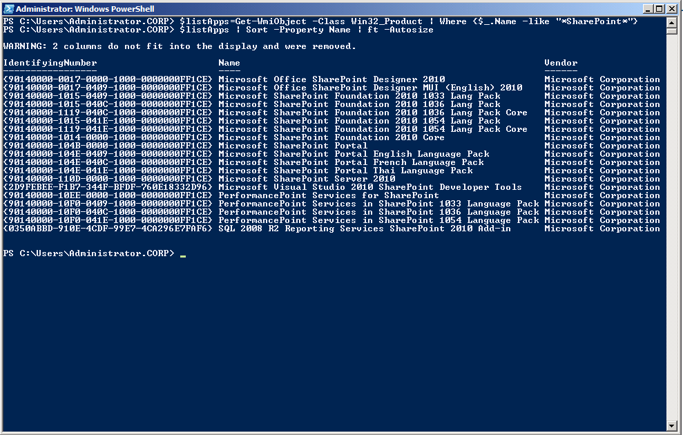PS C:\Users\Administrator.CORP> $listApps=Get-WmiObject -Class Win32_Product | Where {$_.Name -like “*SharePoint*”}